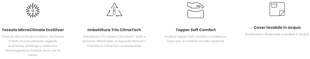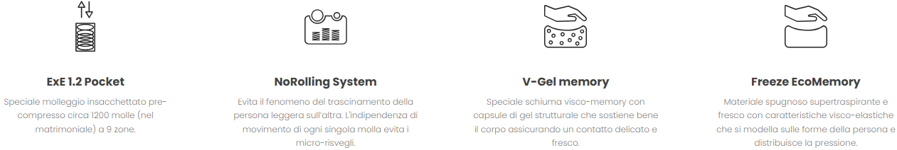 MayFair è il materasso molle insacchettate e memory con molle insacchettate ExE 1.2 Pocket (circa 1200 molle nella versione matrimoniale) e topper di comfort su di un lato. Il materasso è ideale per tutte le persone, singoli o coppie, di tutti i pesi e corporature, grazie alla struttura sostenuta ed all’accoglimento garantito da doppio strato di Freeze EcoMemory più V-Gel Memory. Il prezioso tessuto MicroClimate EcoSilver con trama in filato di pura cellulosa vegetale ecofriendly è anallergico, antiacaro, termoregolatore, inodore, sicuro per la salute. MayFair è “No Turn”: si utilizza tutto l’anno da un solo lato, non si deve capovolgere e non necessita particolare manutenzione.
