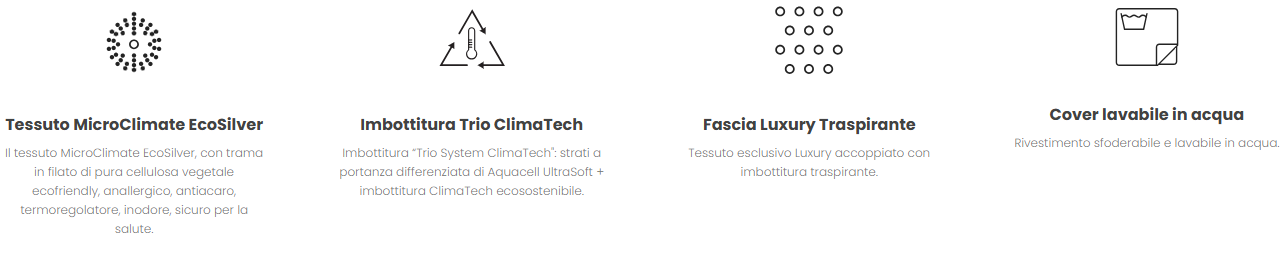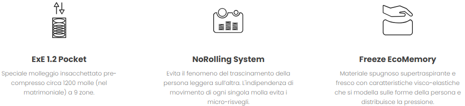 Opera è il materasso molle insacchettate e memory con molle insacchettate ExE 1.2 Pocket (circa 1200 molle nella versione matrimoniale) ed topper interno in Freeze Ecomemory. Il materasso è ideale per tutte le persone, di peso fino a 110 kg, grazie alla struttura sostenuta ed all’accoglimento garantito dall’alto strato di Freeze EcoMemory. Il prezioso tessuto MicroClimate EcoSilver con trama in filato di pura cellulosa vegetale ecofriendly è anallergico, antiacaro, termoregolatore, inodore, sicuro per la salute. Opera è “No Turn”: si utilizza tutto l’anno da un solo lato, non si deve capovolgere e non necessita particolare manutenzione.