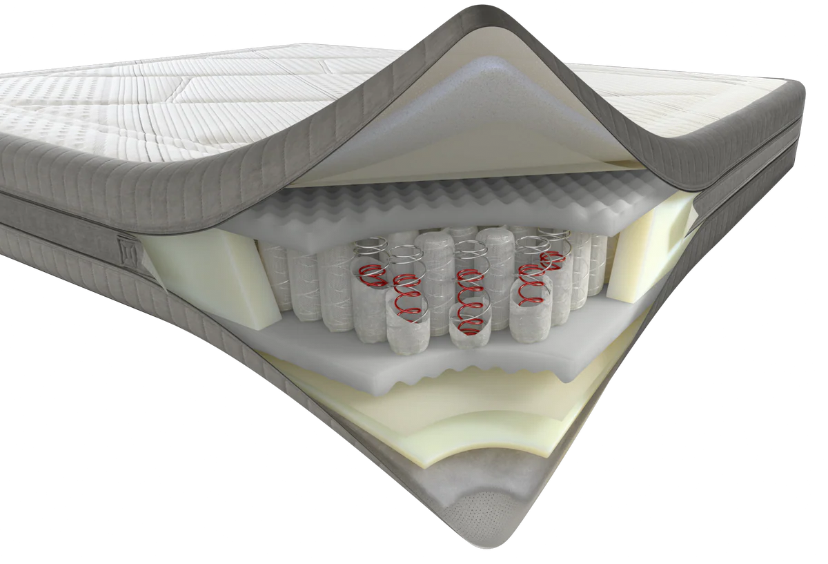 Comfort calibrato e traspirante, ideale in ogni stagione. Il rivestimento in viscosa, arricchito dalla fascia in velluto, esprime eleganza e attenzione ai dettagli. L'imbottitura in Myform Memory Air Clima sul lato invernale offre un’accoglienza termoregolante e traspirante. Fibersan e CoolPhase garantiscono protezione e gestione ideale del microclima. Il molleggio Twin System, con spirale doppia, offre un sostegno calibrato e preciso, accompagnato da FisioMassage, che asseconda il corpo con fluidità. Sul lato estivo, l’imbottitura in cotone e Ingeo assicura freschezza naturale e dispersione ottimale dell’umidità. Levant, l’eleganza del comfort che accompagna ogni stagione.